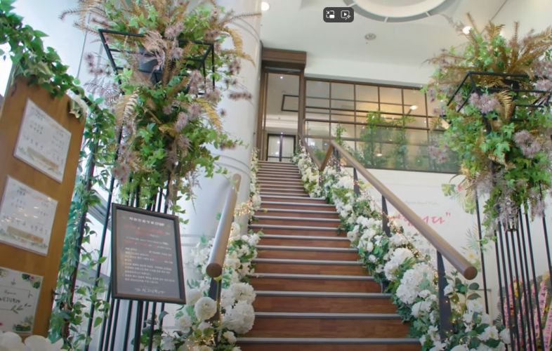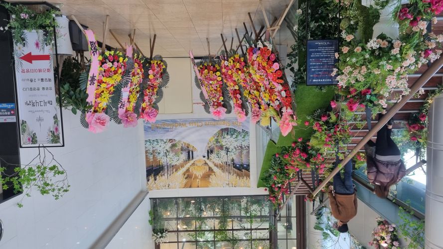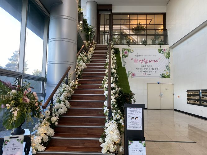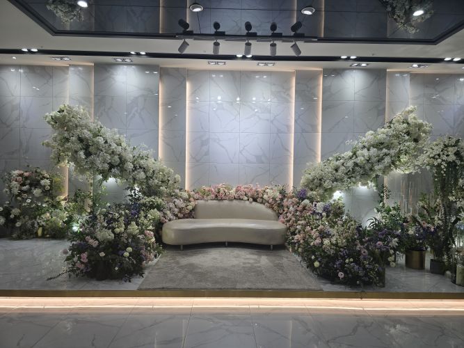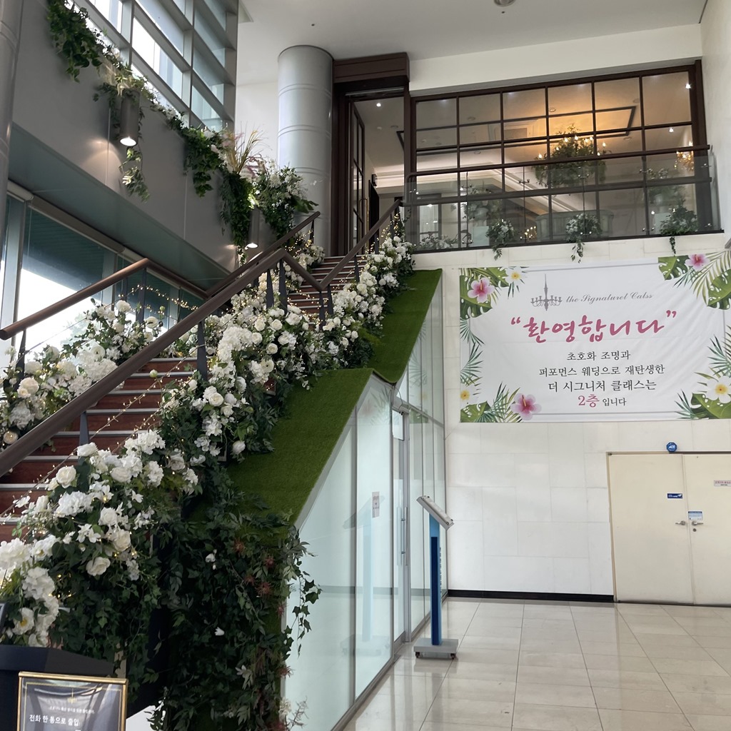 아쉬운점은 생화 비중이 좀 낮은편 같았어요 다른 웨딩홀 투어할 때는 신부대기실이랑 홀내부에서도 꽃향기가 가득했는데 여기는 아니였어요