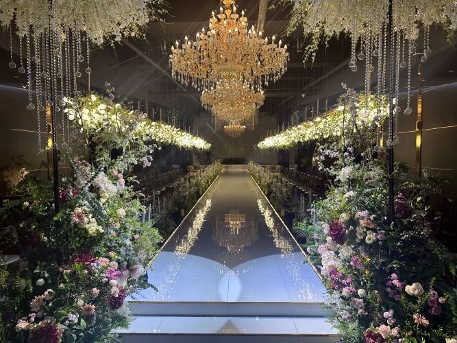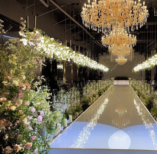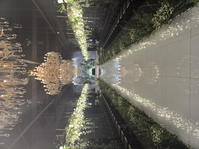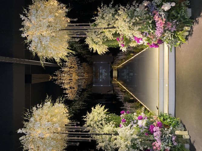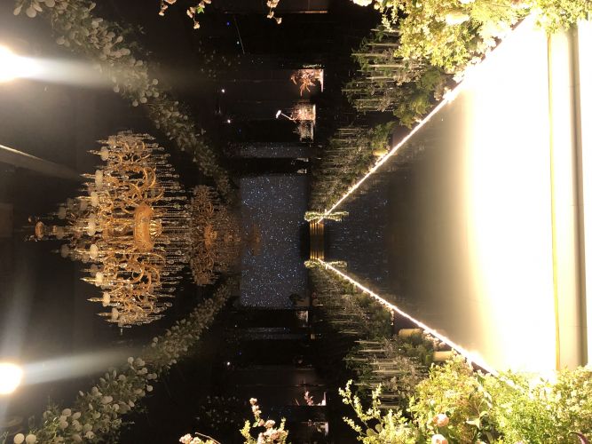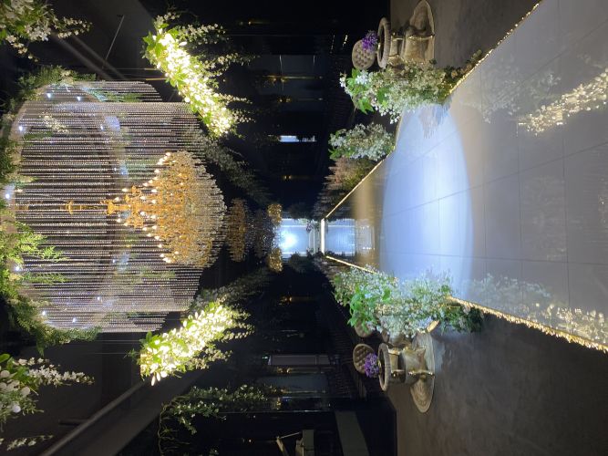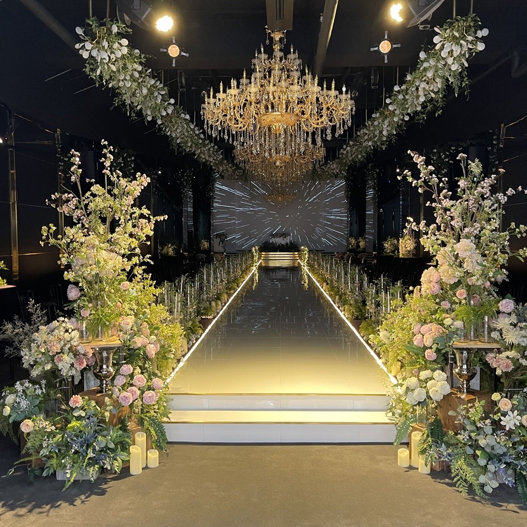 신랑 입장이 평범하게 홀 뒤에서 걸어서 등장하는 거랑 무대 뒤에서 웅장하게 등장하는 게 있었어요. 무대 뒤에서 멋지게 등장하는 게 색달라서 좋고 신부 입장은 홀 뒤에서 걸어서 등장하는데 양옆에 조명 장식이 신부 걸음에 맞춰 천천히 조명이 비치면서 내려옵니다!