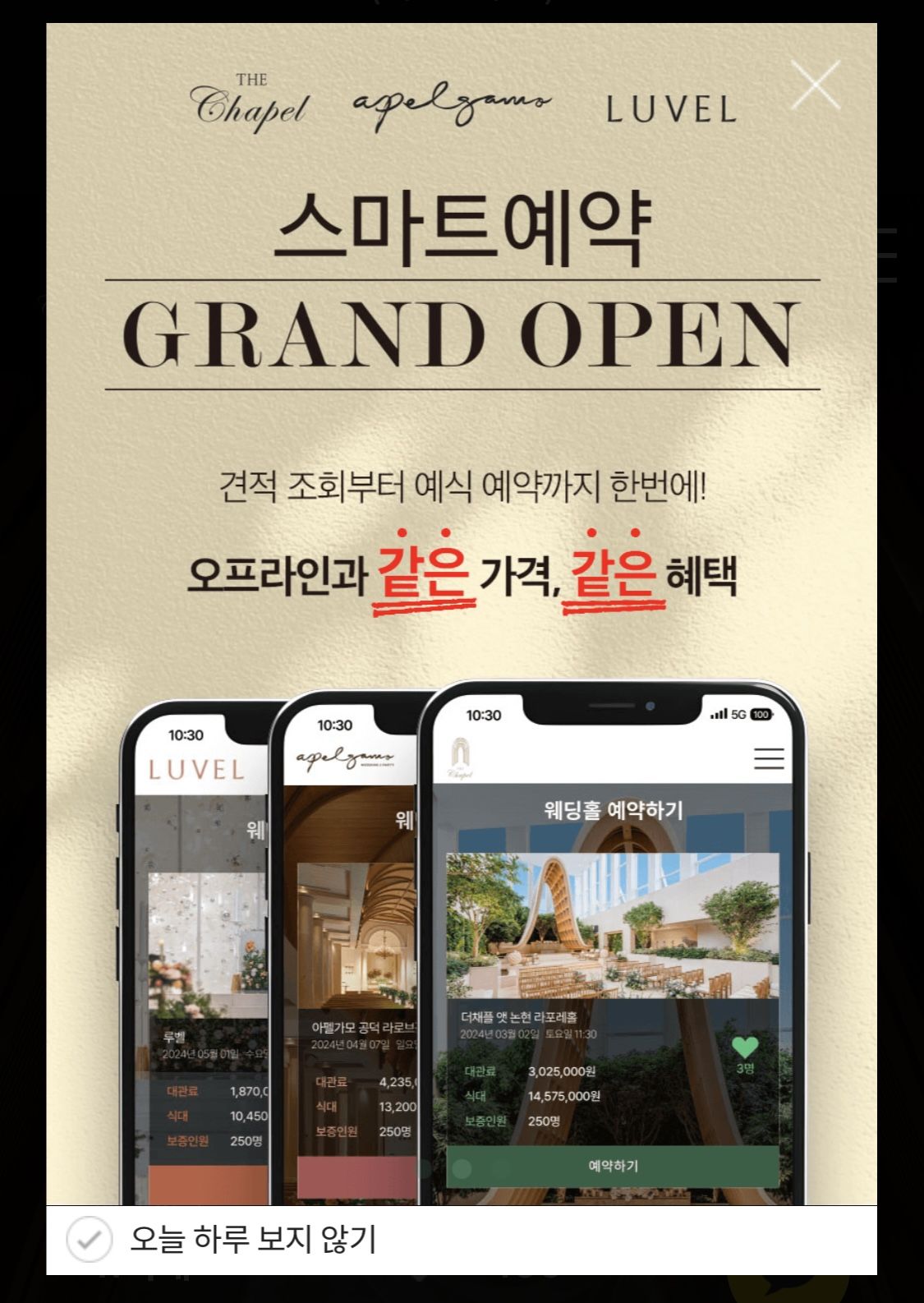 더 채플 앳 청담은 친구 결혼식으로 두세번 가봤던 곳인데 고급스러웠던 기억이 있어서 가격이 비쌀까봐 걱정됐습니다. 스마트예약 홈페이지 들어가서 견적을 내봤는데, 생각했던 것보다 저렴해서 바로 온라인 상담예약을 했습니다.