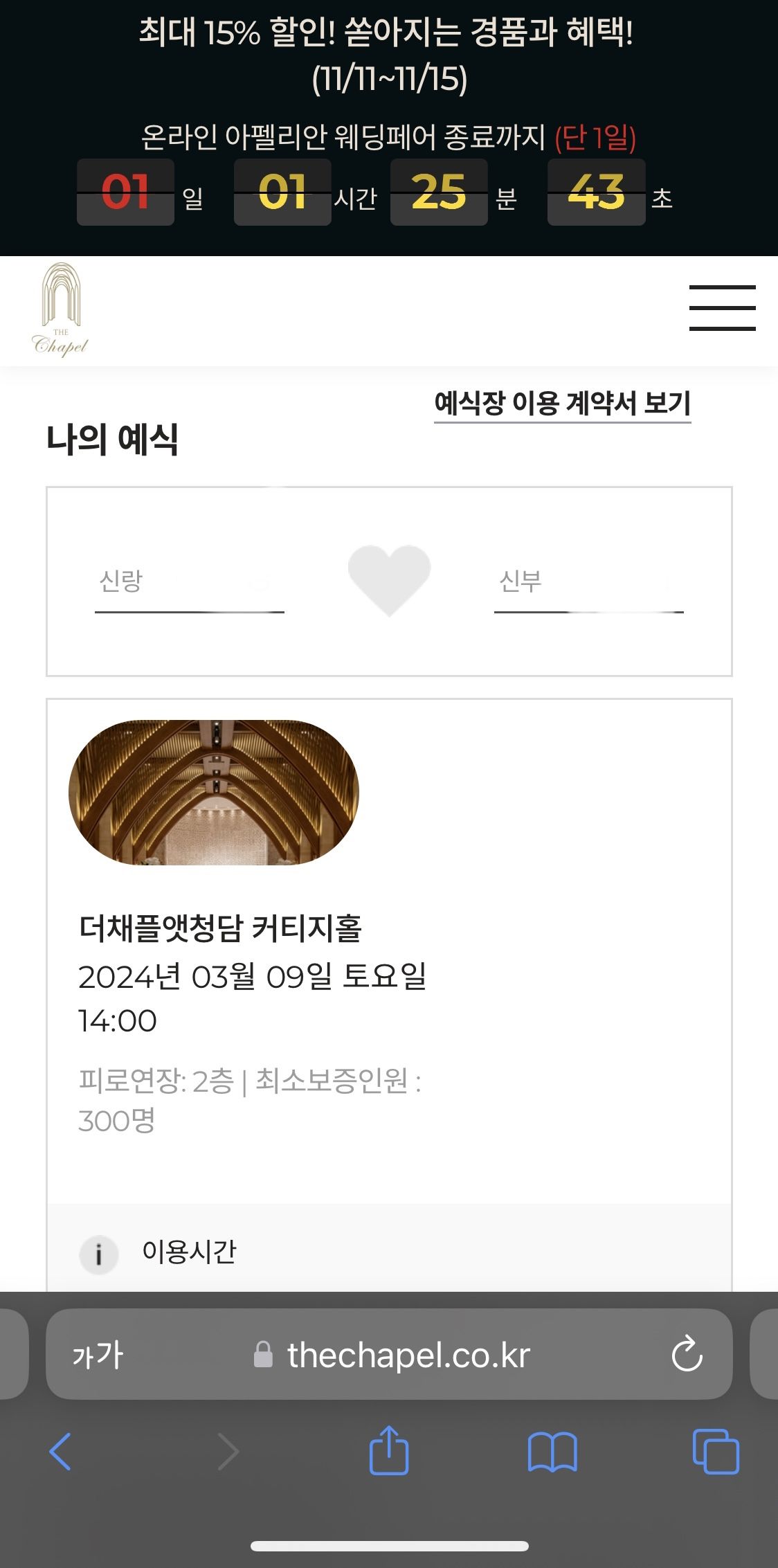 한*지 2023.11.14바로 며칠전 토요일, 더 채플앳 청담으로 최종 예식장 계약을 마쳤습니다!